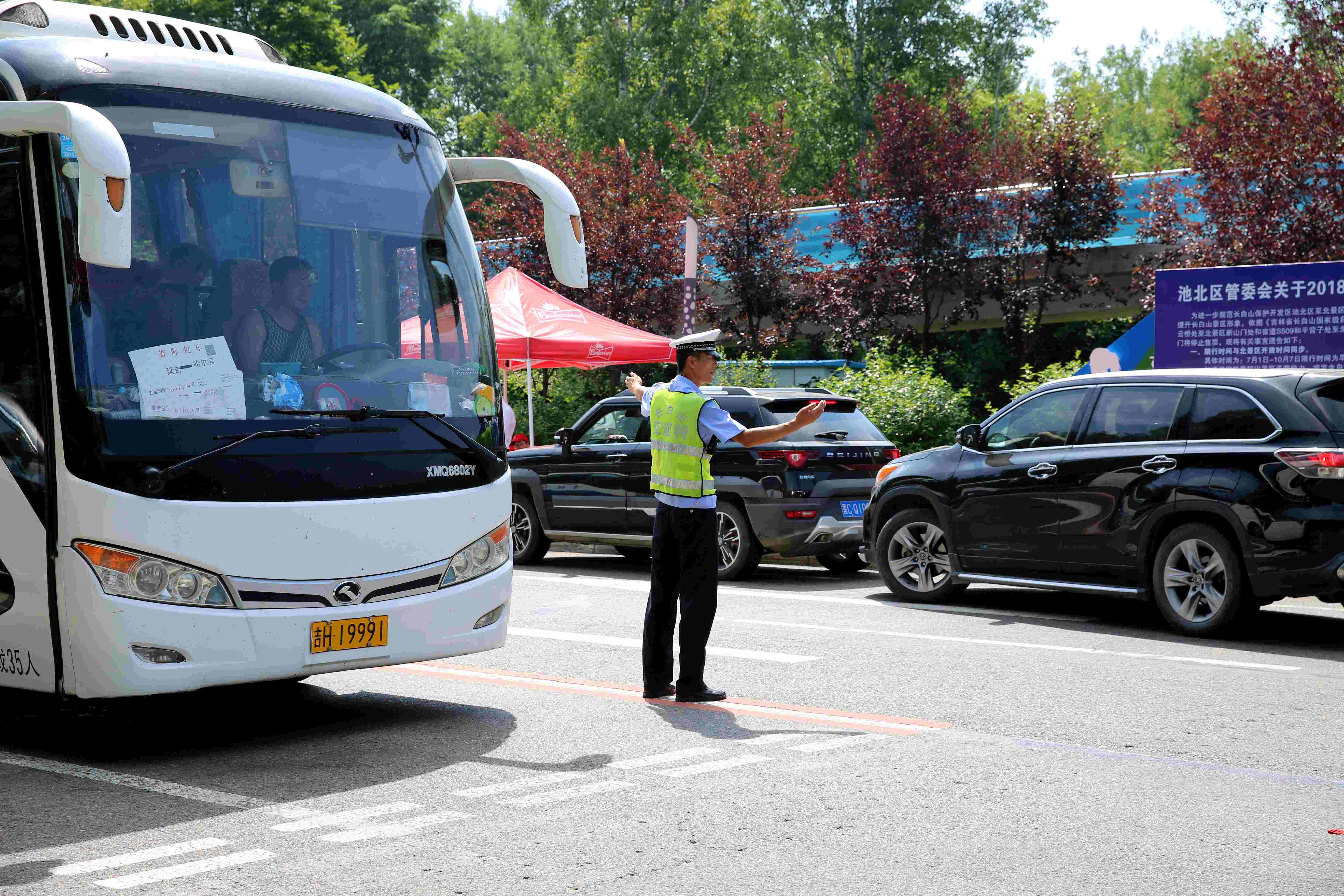 二、因地制宜,疏导交通。根据今年游客集散中心地理位置设置以及往年工作经验,巡特警支队执勤民警每日早6点准时到达望云桥执勤卡点、环区公路宝马检查站执勤卡点以及S203安图方向出城口执勤卡点,进行交通管理工作的同时分流旅游车辆。各卡点执勤民警一方面与志愿者共同向入区旅游车辆驾驶员讲解长白山景区限行措施并将其引导到游客集散中心购票上山,一方面检查入区车辆,严肃处理各类交通违法行为。