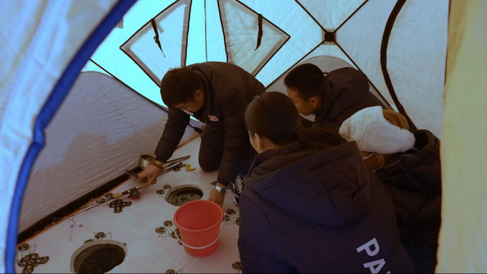 冰上钓鱼是长白山冬季极具特色的亲子体验项目。在冰封的湖面之上,工作人员早已凿好一个个冰洞,备好钓鱼工具。孩子们在父母的指导下,小心翼翼地将鱼饵挂在鱼钩上,放入冰洞之中,耐心等待鱼儿上钩。当感受到鱼线传来的拉力,孩子们兴奋地呼喊着拉起鱼竿,亲眼见证一条条肥美的冷水鱼跃出冰面,脸上洋溢着满满的成就感。